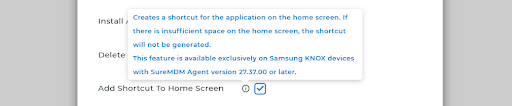 Using the Install Application job with the Add Shortcut To Home Screen option allows administrators to deploy applications while ensuring quick and easy access for users. This feature is particularly useful for Samsung KNOX devices where consistent app visibility is required.