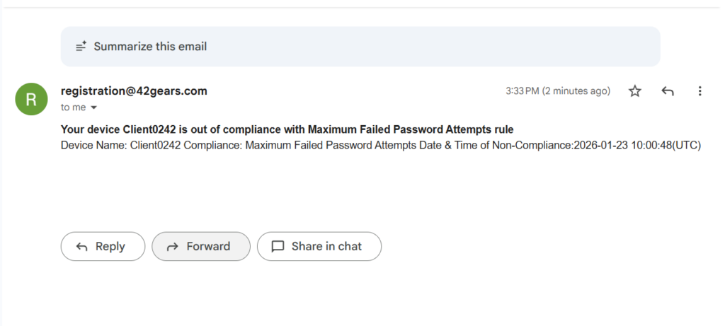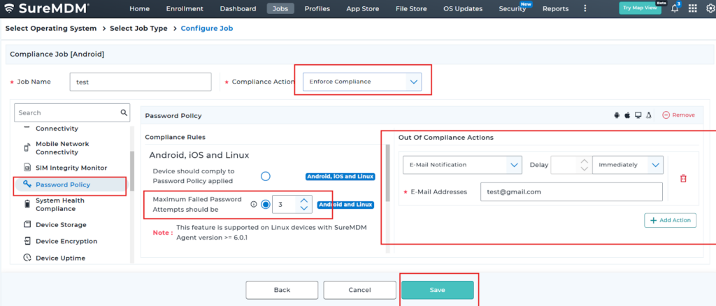 This knowledge base article explains how IT administrators can use a Compliance Job in SureMDM to automatically notify an administrator when a user reaches the maximum number of password attempts on a managed Android device. This ensures timely awareness of potential security risks and enables quick remediation.