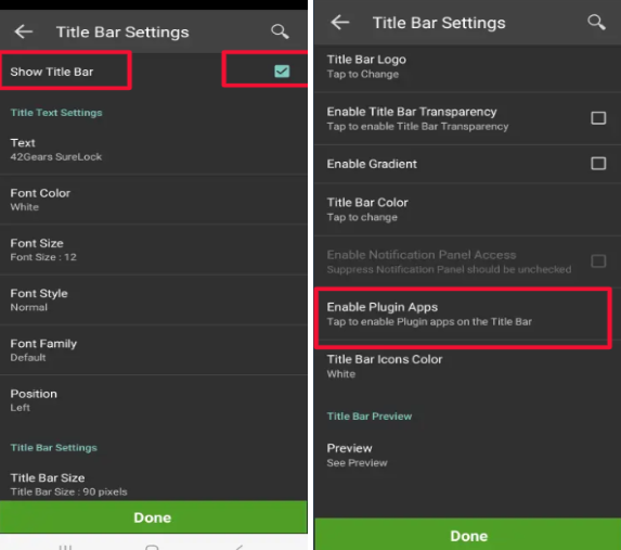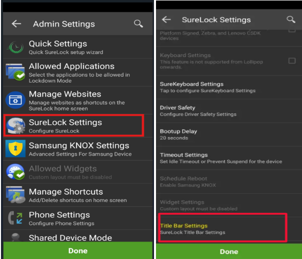 2. Navigate to the Surelock Settings option > tap on Title Bar Settings to enter the configuration page and enable Show Title Bar (unchecked by default).