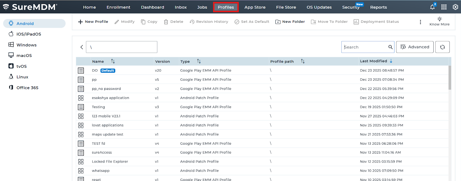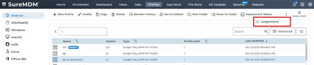 SureMDM allows administrators to efficiently apply profiles to devices by associating them with the appropriate device groups via the Assignment Tab under Profile Tab.