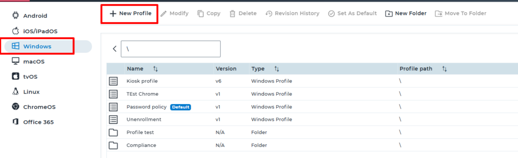 - Login to SureMDM console > Navigate to Profile > select Windows.