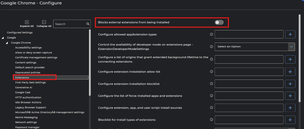 - Expand Google → Google Chrome → Extensions, enable the “Block external extensions from being installed” option, as shown in the screenshot below. And configure as per the below steps.