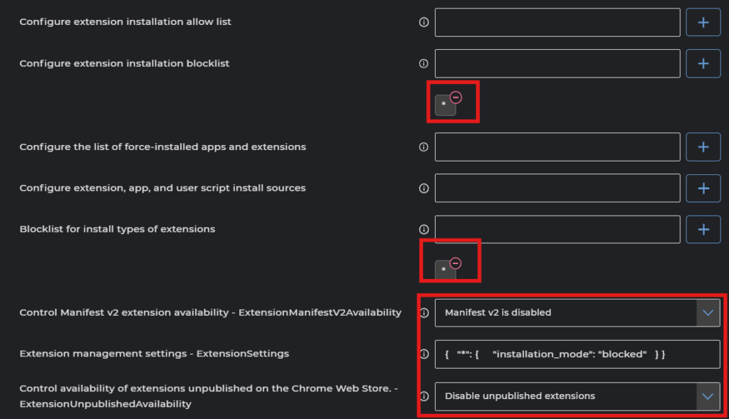 Choose Manifest v2 is disabled - Extension management settings – ExtensionSettings (Ensures all extensions are blocked by default)