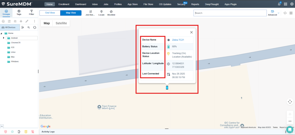 Note: When we click on Map View – The console will switch to a map-based layout displaying devices on their respective geographical locations.