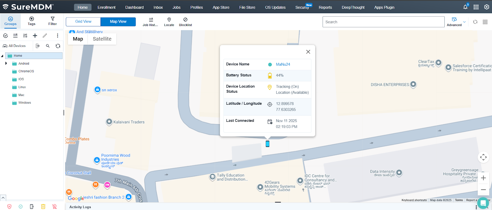 Once configured, the SureMDM Console displays devices in the New Device Grid layout with their real-time locations on the map. Administrators can view device status, platform, and geographical distribution simultaneously. The enhanced Maps View adds contextual details like Floor, Space, and Device Count, allowing precise asset tracking within physical environments.