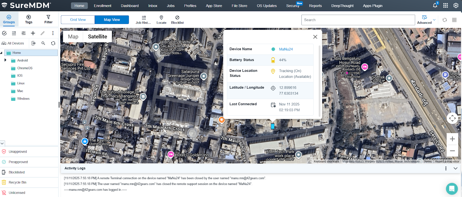 Note: When we click on Map View – The console will switch to a map-based layout displaying devices on their respective geographical locations.