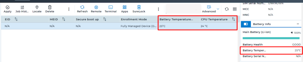 SureMDM provides the ability to monitor device health parameters such as Battery Temperature and CPU Temperature through Device Grid views, Device Information panel, and Reports.