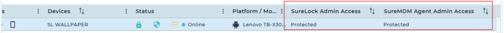 - Once the column is enabled, we can verify through SureMDM Console if the Admin access for SureLock and SureMDM Agent is protected or not.