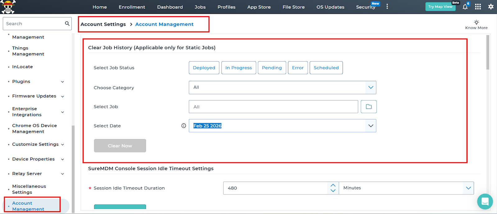 This article explains how to clear job history from the SureMDM console.Clearing job history helps administrators maintain a clean console view by removing old or unnecessary static job records.