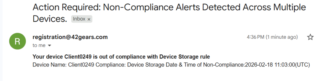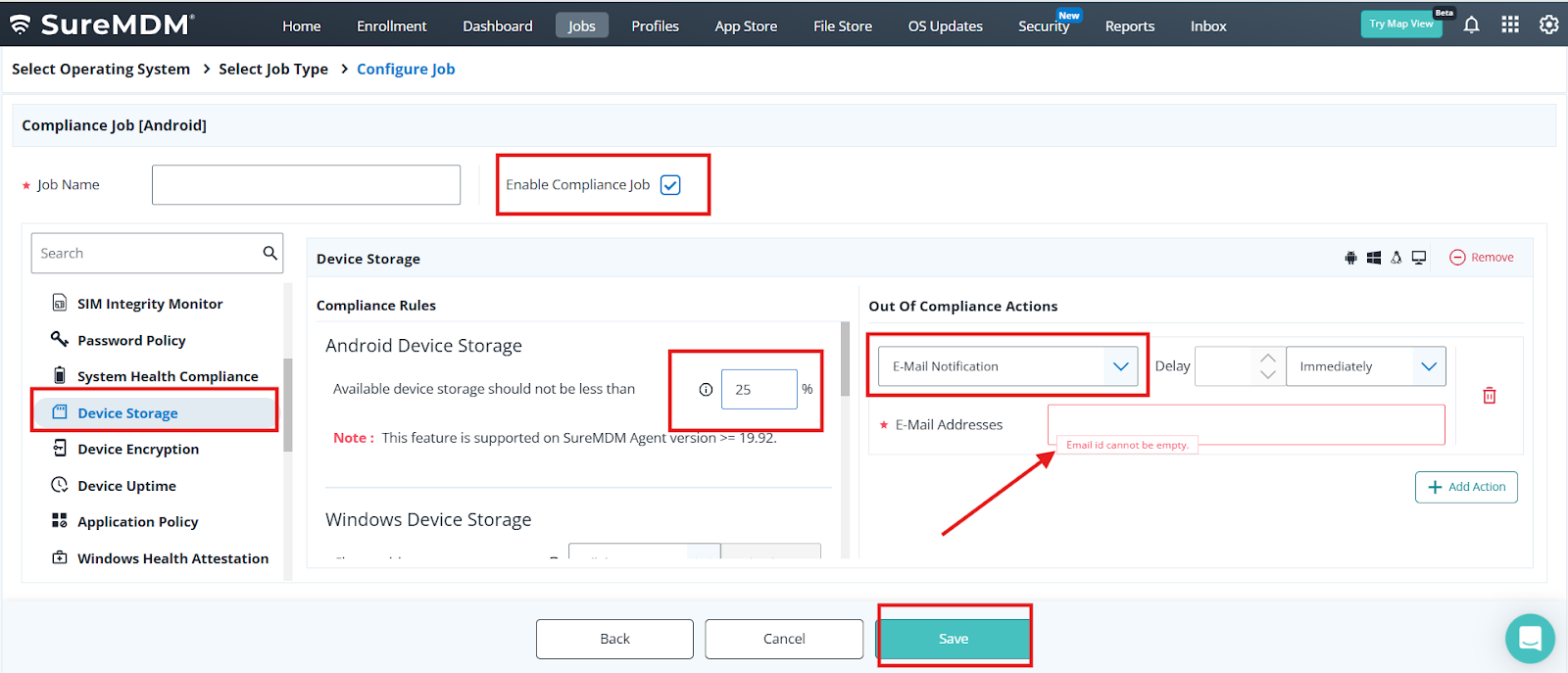 By configuring a Compliance Job in SureMDM, administrators can automatically receive email notifications when device storage drops below a specified percentage. This proactive monitoring helps prevent device performance issues, application failures, and storage-related disruptions.