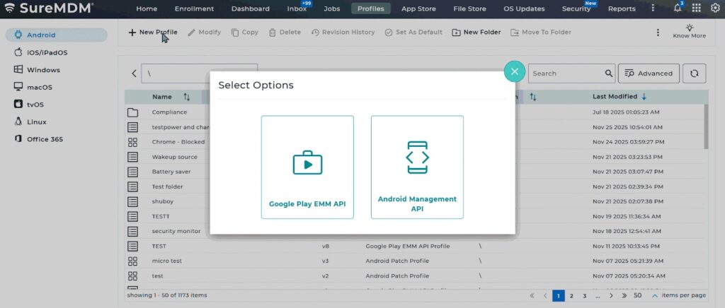 - Log in to the SureMDM console – Profiles- Choose Android – Select the Google Play EMM API profile type – Choose the Primary Profile – Scroll to OEM config policy – select Datalogic OEMConfig (Datalogic).