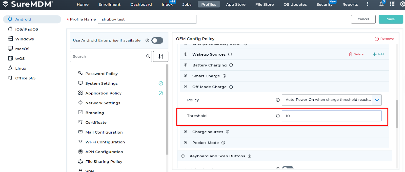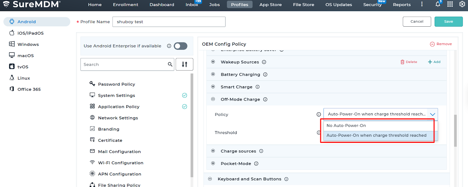 Using SureMDM OEMConfig policy, administrators can remotely configure the Off-Mode Charge setting on all devices at once. This helps ensure devices charge properly, follow company requirements, and are ready for use without manual setup on each device.