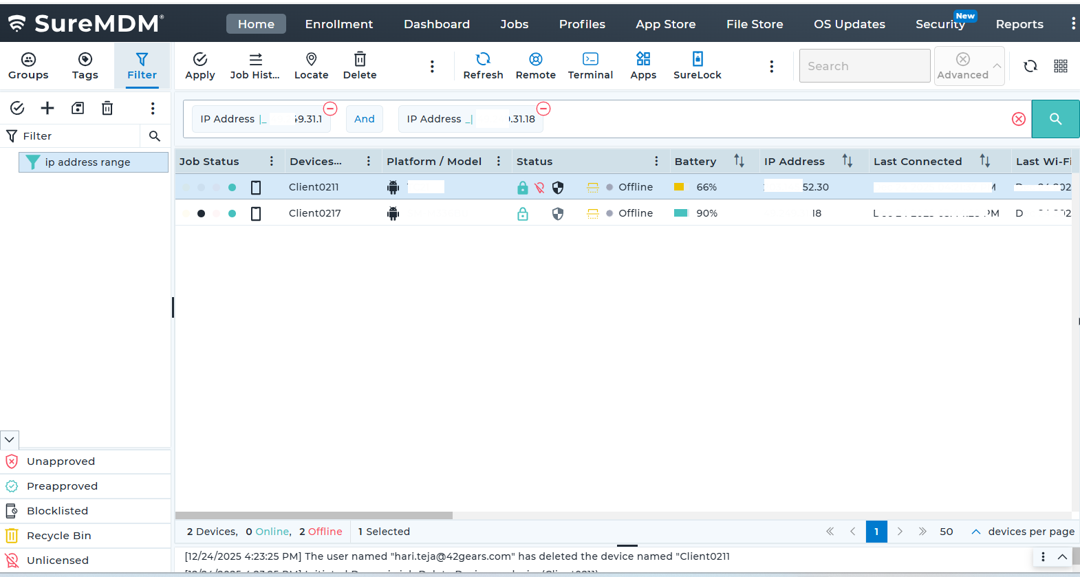 • Devices are enrolled in SureMDM and reporting IP address information.