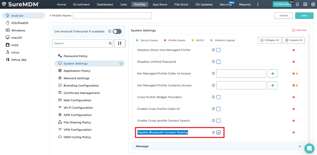 This feature allows the administrator to disable Bluetooth contact sharing on BYOD (Profile Owner) devices using a SureMDM profile, preventing Bluetooth devices from accessing enterprise contacts.