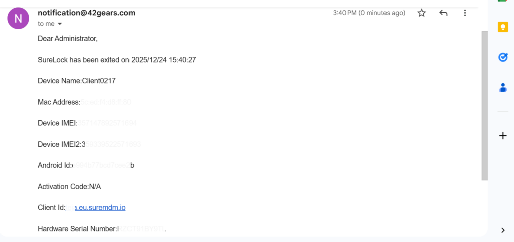 This article describes the steps to enable email alert notifications in SureLock when a user exits or accesses SureLock settings. This helps administrators monitor device activity and quickly respond to unauthorized changes or exits from SureLock lockdown mode.