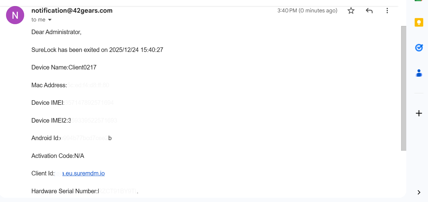 - Once applied, the device will send an email alert whenever a user exits or accesses SureLock settings.
