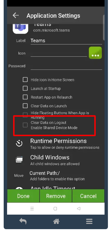 Note – By enabling the ‘Clear data on Logout’ feature for each allowed application, SureLock ensures that all app-specific data is deleted when the user logs out of their profile. This safeguards user data and meets compliance requirements for devices that are shared by multiple users, preventing information leakage between sessions.