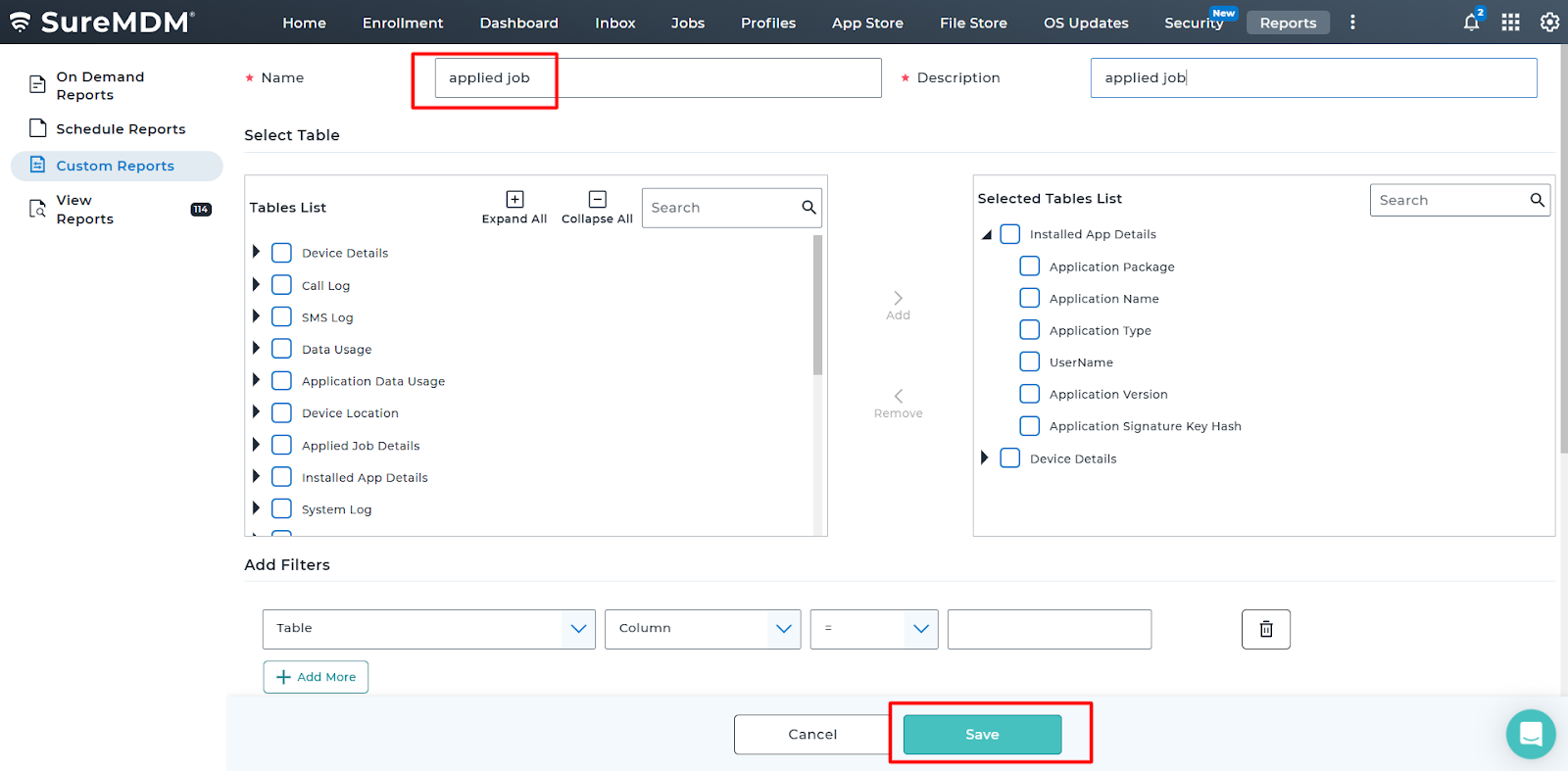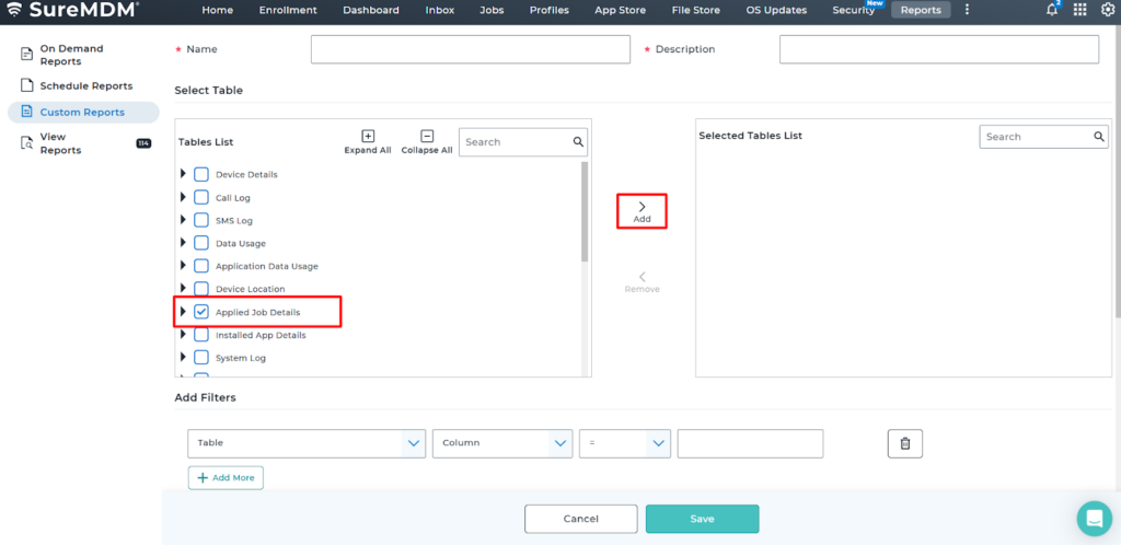 1. Login to the SureMDM console > Click on the Reports tab > Choose Custom Reports and click Add.