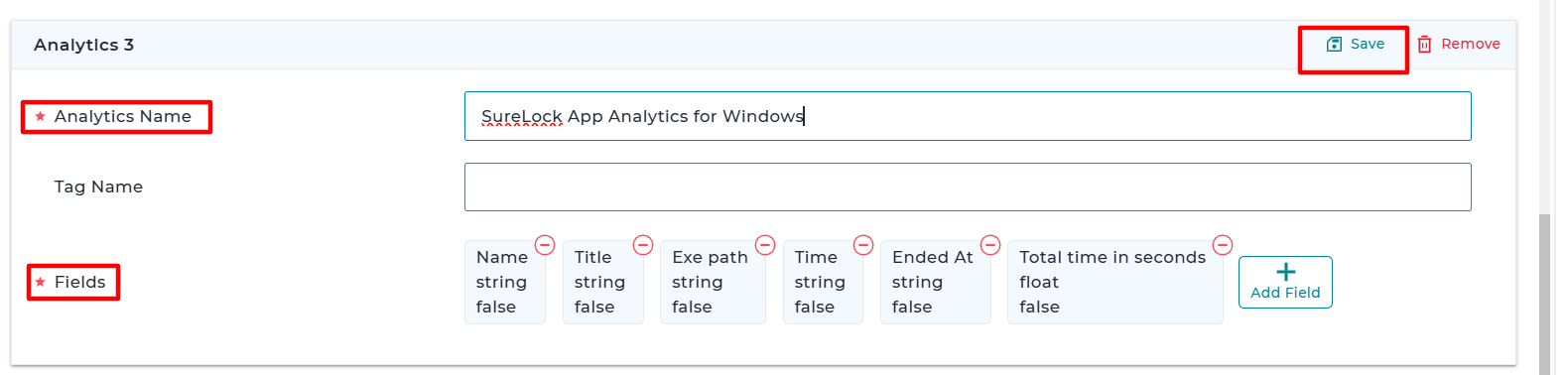 2. Give an Analytics Name and add the following fields and Save.