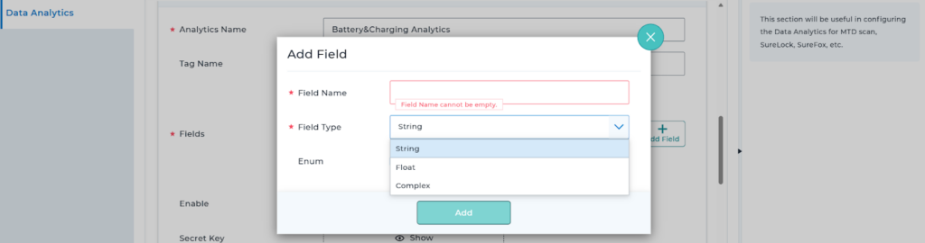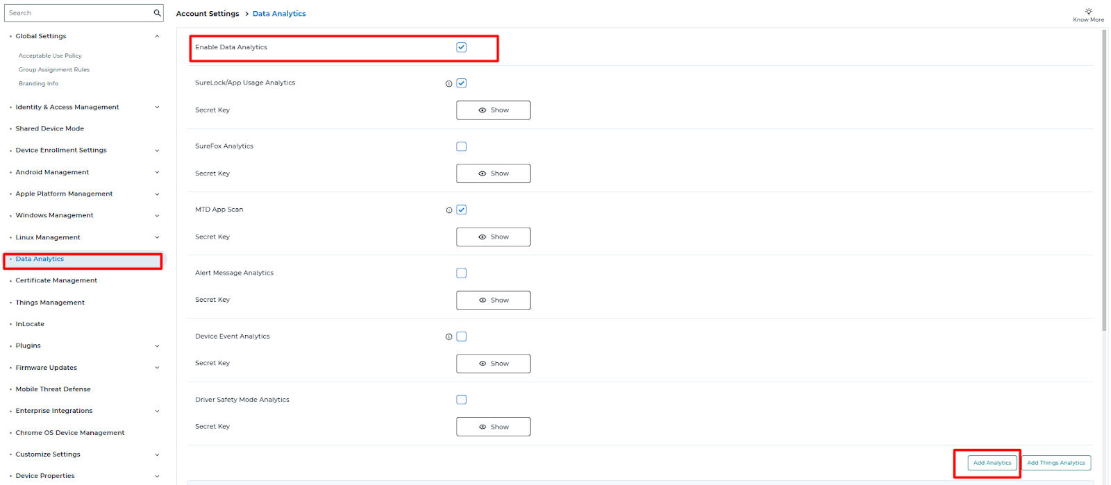 1. Log into the SureMDM Web Console > Select Account Settings > Select Data Analytics >Check the Enable Data Analytics checkbox > Click Add Analytics.