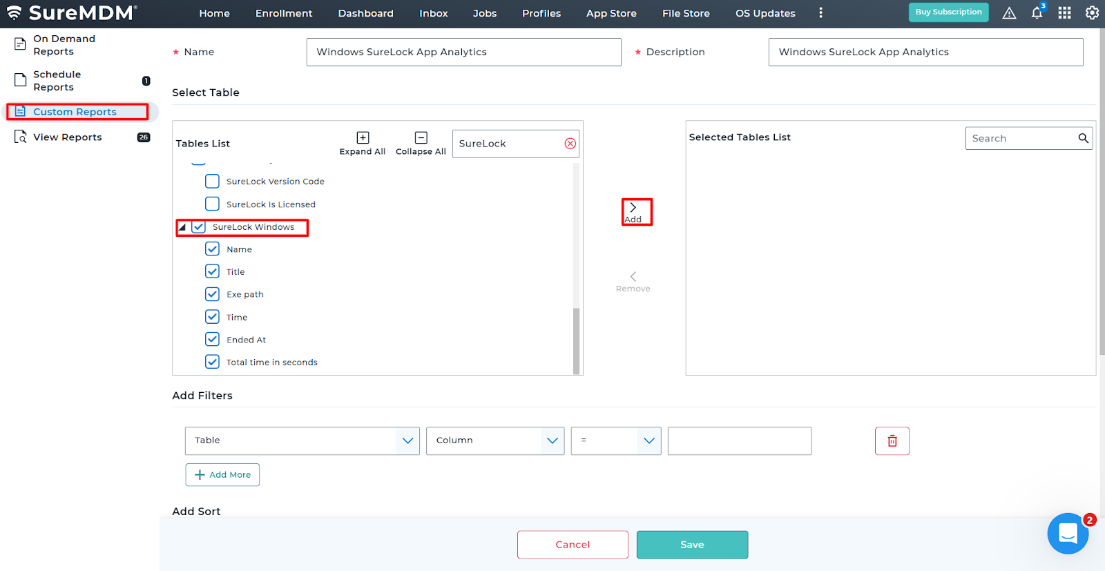 3. From the Tables List section,Search for the SureLock Analytics we have created in Step1. > Add to l appear in the Selected Tables List > Save the report.