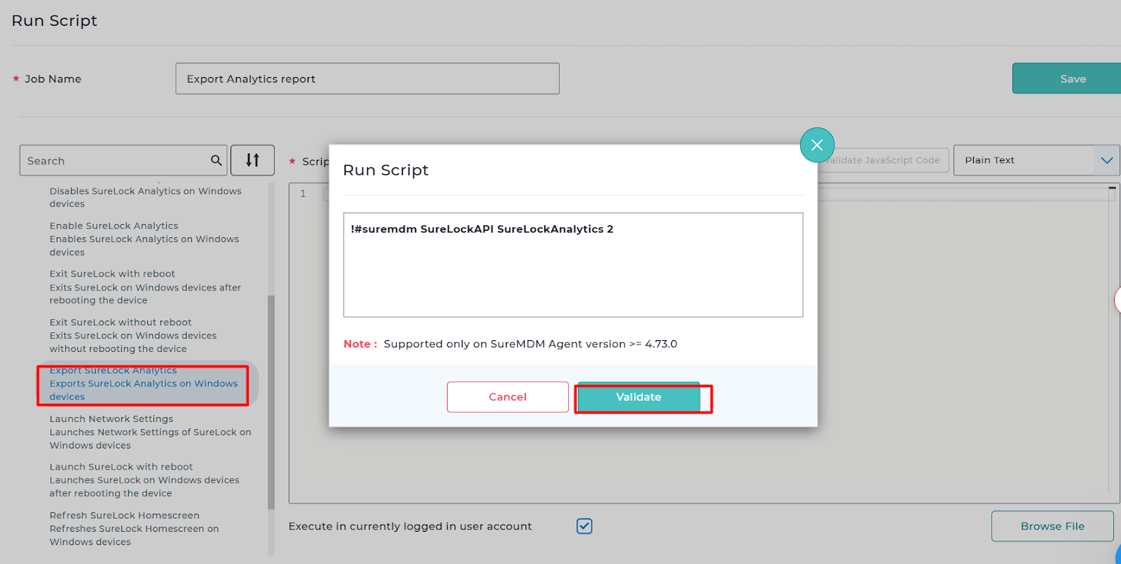 2. Search for Enable SureLock Analytics, Enter the Secret Key from the pointer 3 of Step 1, Validate and Save the job.