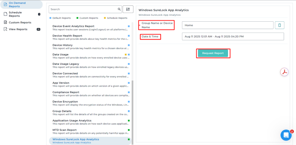 5. Navigate to On Demand report > Search for the created Custom Report “Windows SureLock App Analytics”.