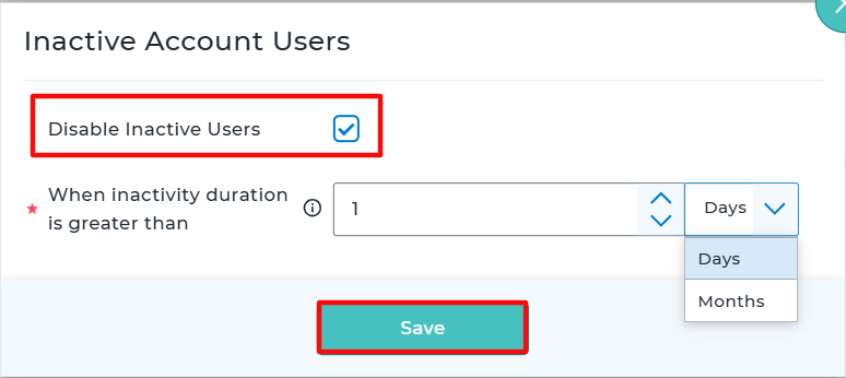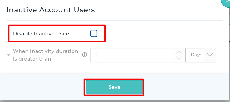 To Disable the Inactive Account users feature, Uncheck the option Disable Inactive Users and click on save. This will make sure, no Inactive user accounts will be disabled due to inactivity.