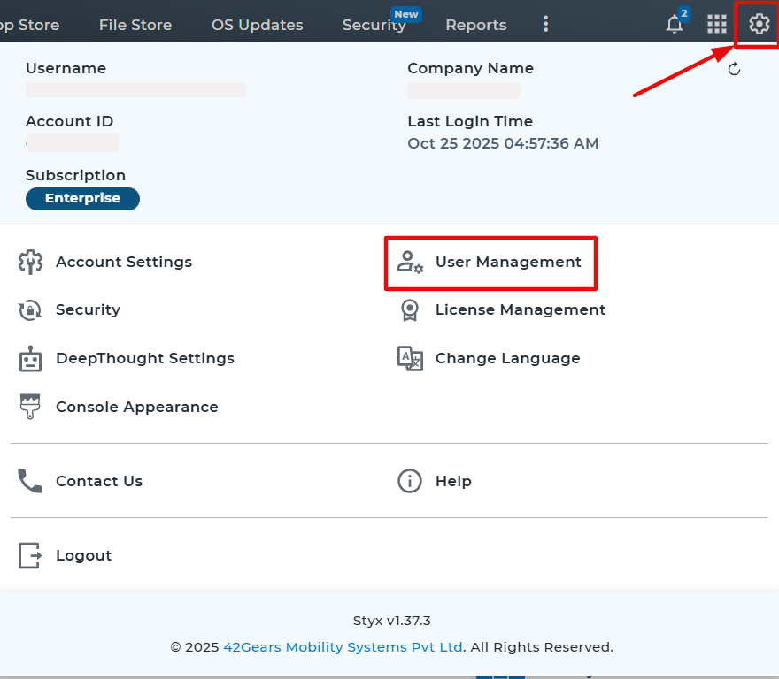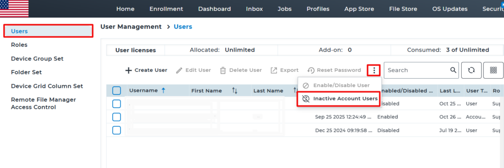 The “Disable Inactive Users” feature helps administrators maintain security and ensure that only active users have access to the SureMDM console. By automatically disabling user accounts that remain inactive for a defined period, this feature minimizes the risk of unauthorized access and improves overall account management efficiency.