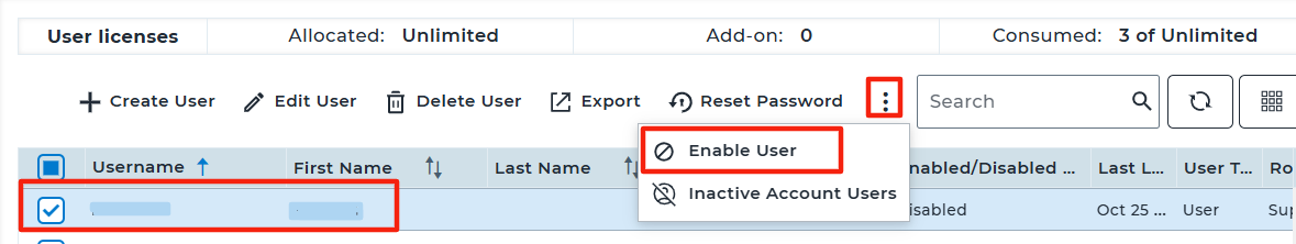 Admin can re-enable the specific Disabled user by selecting the user hamburger icon-3 dots(⋮) and clicking on Enable user.