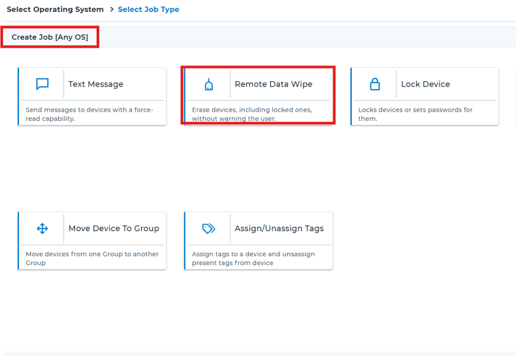 3. Once the above option is enabled, you can create a Remote Wipe Data from the Any OS section or from the specific platform by navigating to Jobs > New Job > Android > Remote Data Wipe (or) Jobs > New Job > Any OS > Remote Data Wipe