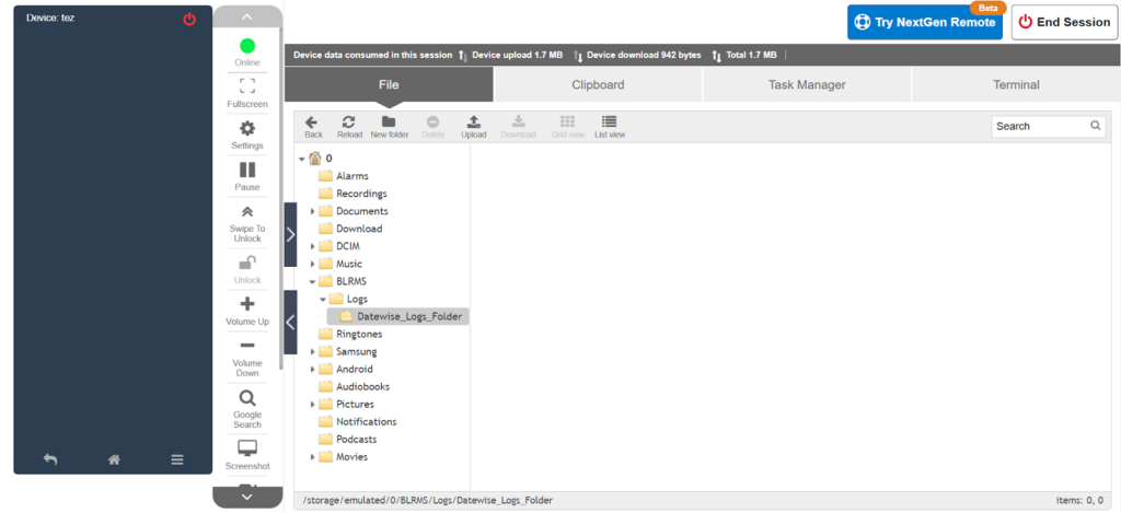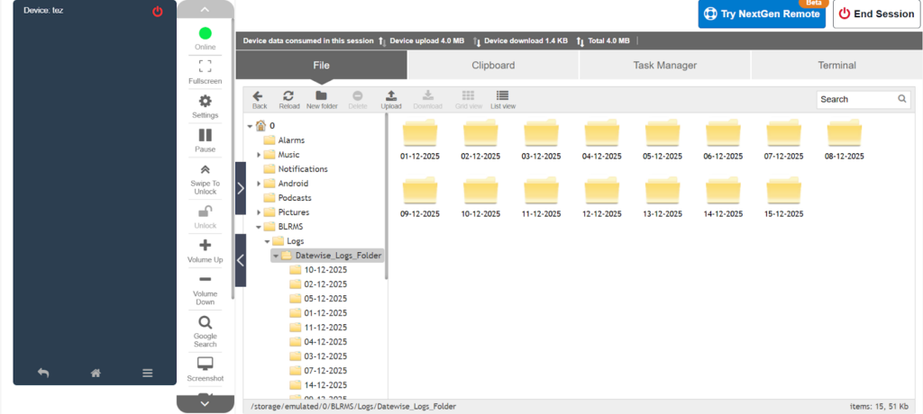The path can be changed as per your requirement, here the path given is – /sdcard/BLRMS/Logs/Datewise_Logs_Folder$folder_name, where the $folder_name is a wildcard variable for the folder name defined.