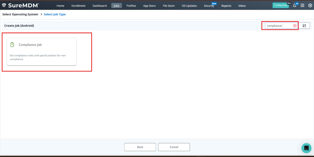 2. Click on the Android option and search for the Compliance job.