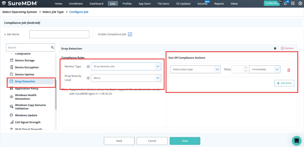 The Drop Detection compliance job allows administrators to track how devices are handled and maintain hardware health. They can define thresholds for drop counts or severity. If a device goes beyond these limits, it is flagged as non-compliant, triggering alerts or automated protective actions.