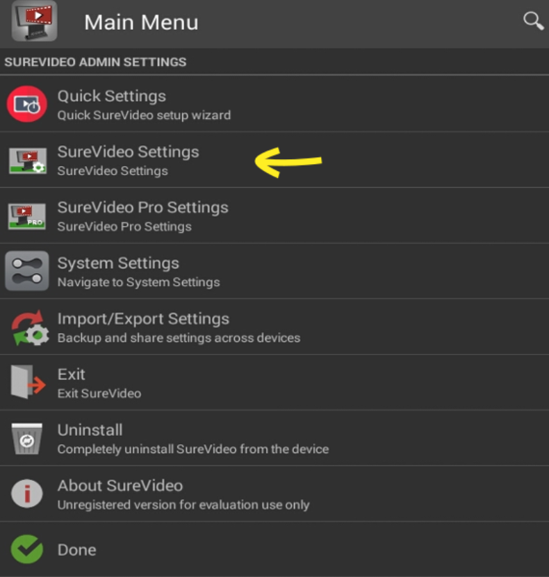 4. On the Main Menu screen, tap the SureVideo Pro Settings option.