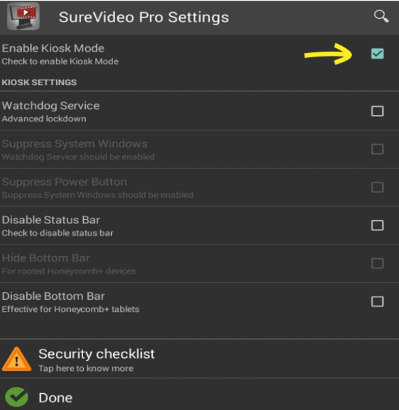 5. On the SureVideo Pro Settings screen, enable the Enable Kiosk Mode option. Tap Done to complete.