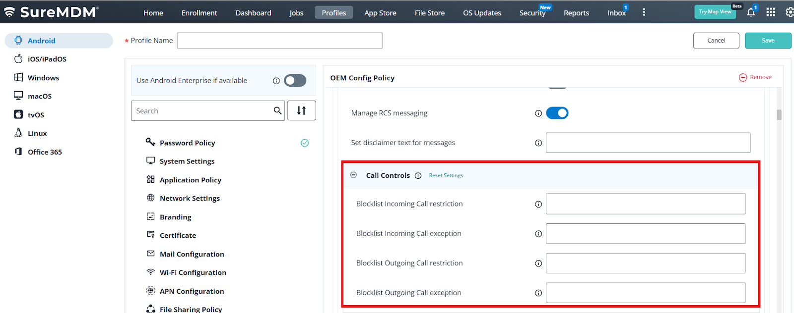 Using the Samsung OEMConfig policy in SureMDM, administrators can centrally configure and enforce call restrictions on Samsung devices, ensuring controlled voice communication, improved security, and consistent policy compliance across the managed device fleet.