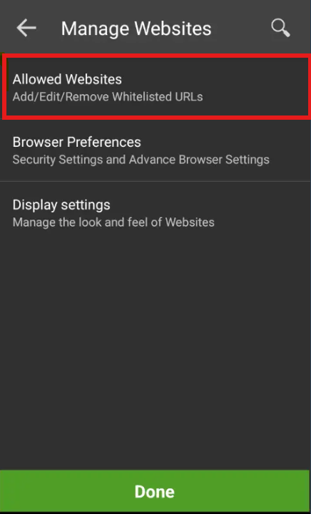 1. Navigate to SureLock admin settings and select Manage Websites.