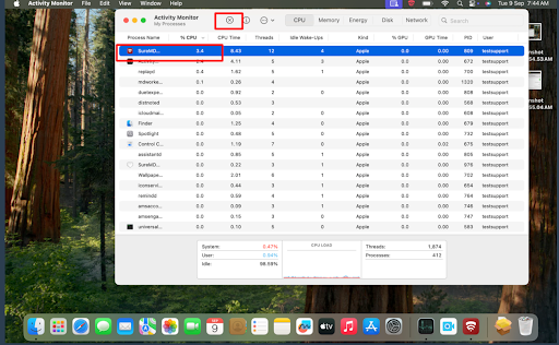 Step 6:-In Activity Monitor, select SureMDM and click the icon shown in the image. When the prompt appears, choose Force Quit.