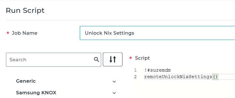 Unlocking SureMDM Agent settings may be required when access is restricted due to Settings Access Protection on Android devices. This article outlines how administrators can use a Run Script job with the remoteUnlockNixSettings() command to remotely restore access. The procedure helps recover from lockouts caused by repeated incorrect attempts without disabling security features. It ensures continued protection of the device while allowing controlled administrative access. This applies to Android devices enrolled in SureMDM with the necessary permissions.