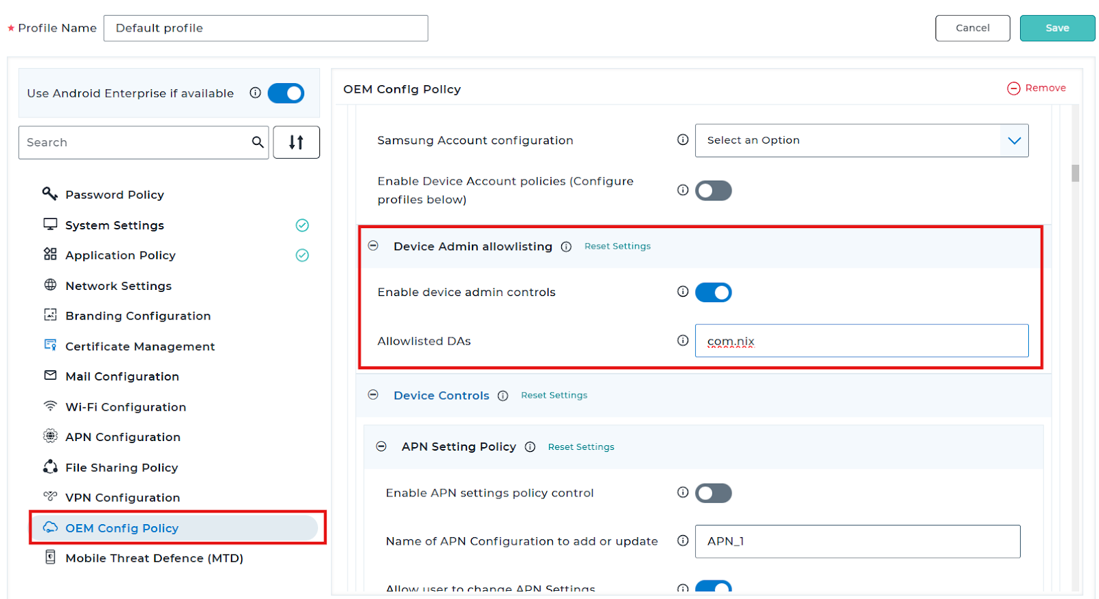 5. Expand the Device Admin allow listing policy menu, and Enable device admin controls.
